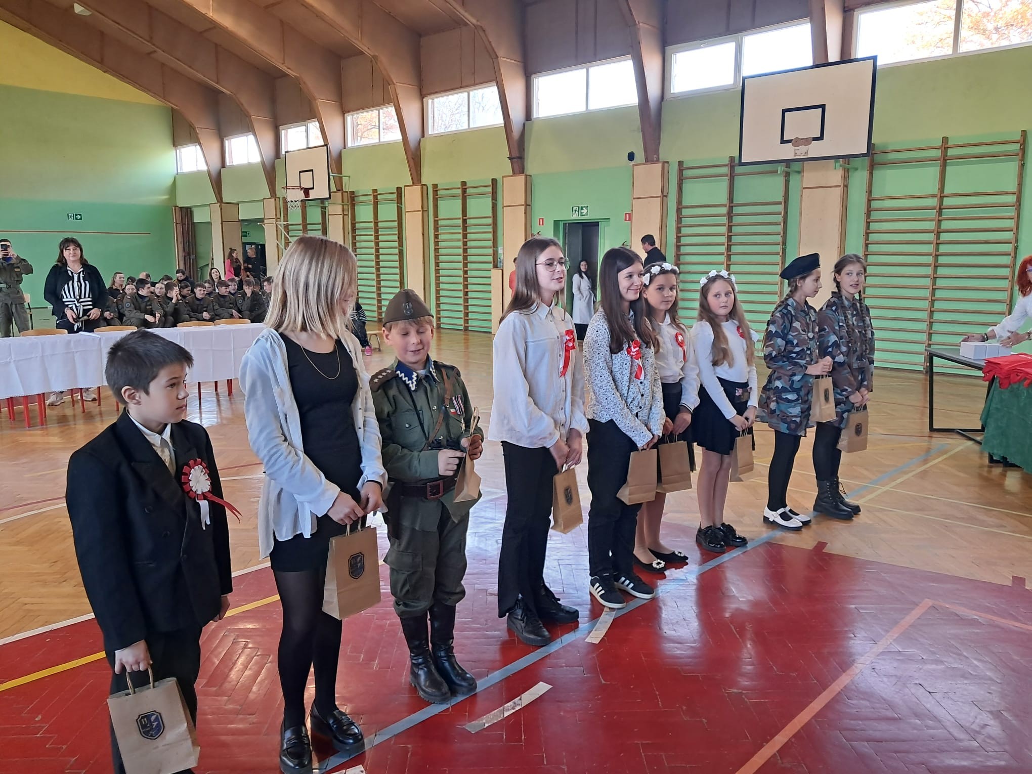 W części artystyczno–historycznej wystąpili uczniowie klasy ósmej, piątej i czwartej: Aleksandra K., Maja P., Blanka R., Zuzanna R., Mikołaj S., Igor W., Miłosz W., Oliwier B., Jakub M. i K. Wcielili się oni w role narratorów, bohaterów historycznych, żołnierzy, harcerzy oraz poetów. Uroczystość uświetniły występy wokalne uczennic z klasy szóstej i piątej: Julii Ch., Leny W., Amelii L. i Antoniny S., które wykonały patriotyczne pieśni, wprowadzając wszystkich w podniosły nastrój.